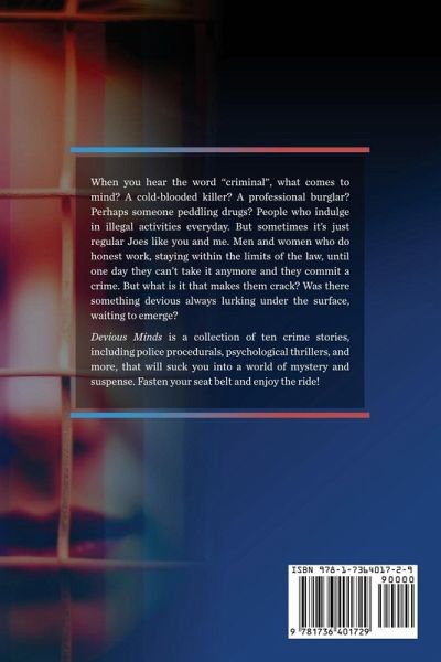 When you hear the word "criminal", what comes to mind? A cold-blooded killer? A professional burglar? Perhaps someone peddling drugs? People who indulge in illegal activities everyday. But sometimes it's just regular Joes like you and me. Men and women who do honest work, staying within the limits of the law, until one day they can't take it anymore and they commit a crime. But what is it that makes them crack? Was there something devious always lurking under the surface, waiting to emerge? Devious Minds is a collection of crime stories, including police procedurals, psychological thrillers, and more that will suck you into a world of mystery and suspense. Fasten your seat belt and enjoy the ride!