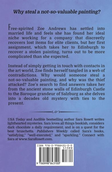 Why steal a not-so-valuable painting? Free-spirited Zoe Andrews has settled into married life and feels she has found her ideal niche working for a company that discreetly recovers lost items for elite clients, but her first assignment, which takes her to Edinburgh to recover a stolen painting, turns out to be more complicated than she expected. Instead of simply getting in touch with contacts in the art world, Zoe finds herself tangled in a web of contradictions. Why would someone steal a not-so-valuable painting, and why was the thief attacked? Zoe's search to find answers takes her from the ancient stone walls of Edinburgh Castle to the Baroque grandeur of Salzburg as she delves into a decades old mystery with ties to the present.