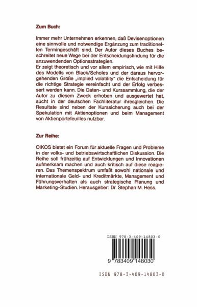 Die Märkte für Devisenoptionen und die dort gehandelten Volumina hatten in den vergangenen Jahren eine geradezu dramatische Expansion zu verzeichnen. Gab es früher für die Absicherung von Fremdwährungs-Cash flows nur die Alternativen Offene Position -also "Nichtstun" -oder Fixierung des Kurses mittels Devisenterminengagement, so trat die Devisenoption aOer Jahre als dritte Dimension hinzu. Zunächst etwas zögerlich Mitte der aufgenommen, haben sich Optionen inzwischen zum festen Bestandteil der Devisenkurssicherungspolitik von Unternehmen entwickelt. Die gestiegene Bedeutung des Instrumentes Devisenoption spiegelt sich in der wach senden Zahl von Veröffentlichungen wider, die kurssicherungsstrategisch ausgerichtet sind. Der Verfasser der vorliegenden Abhandlung, die als von mir betreute Disser tation an der Universität Hamburg angenommen wurde, geht mit einem bewertungsorientierten Ansatz einen neuen Weg. Ausgehend von der Fest stellung, daß Kursprognosen mit großer Unsicherheit behaftet und deswegen nicht das adäquate Mittel für die Auswahl der richtigen Kurssi cherungsstrategie mit Devisenoptionen sind, sucht der Autor in den Optionspreisen nach Informationen für die jeweils "richtige" Strategie. Der entscheidende Schritt ist dabei die Untersuchung der Preiswürdigkeit von Devisenoptionen, das heißt die Klärung der Frage, ob und inwiefern die von den optionspreistheoretisch richtigen bezahlten Optionspreise Optionspreisen abweichen. Dazu stellt der Verfasser eine methodisch über zeugende und einen Zeitraum von mehr als fünf Jahren umfassende empiri sche Untersuchung für US-$/DM-Devisenoptionen an. Er zeigt, daß Optionspreise meist "überschießen", Optionen also entweder zu teuer oder zu billig gehandelt werden.