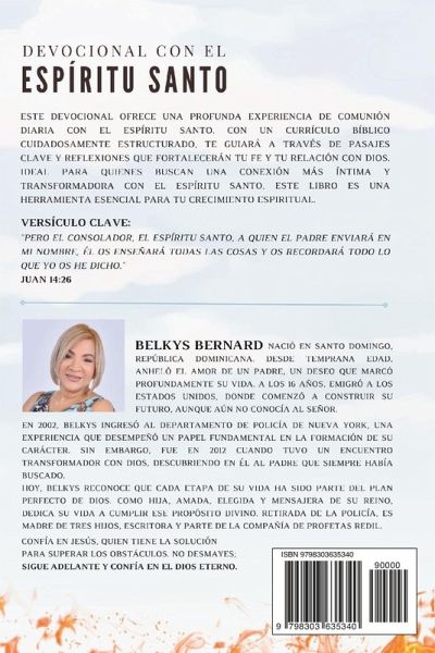 ¡Descubre una relación más profunda con el Espíritu Santo! Devocional con Él Espíritu Santo es una guía espiritual diseñada para ayudarte a conectar de manera íntima y transformadora con el Espíritu Santo. Este devocional diario está estructurado con reflexiones bíblicas cuidadosamente seleccionadas que fortalecerán tu fe y tu relación con Dios. ¿Qué encontrarás en este libro? * Un enfoque práctico y espiritual para experimentar la presencia del Espíritu Santo en tu vida diaria. * Reflexiones basadas en pasajes clave de las Escrituras, diseñadas para inspirarte y guiarte. * Versículos poderosos como "El Consolador, el Espíritu Santo, a quien el Padre enviará en mi nombre, él os enseñará todas las cosas y os recordará todo lo que yo os he dicho." (Juan 14:26). La autora, Belkys Bernard, madre, exoficial de policía y escritora brinda su toque único y personal en su relación con El Espíritu Santo y lo compartirá contigo en los siguientes devocionales. Ideal para: * Quienes buscan fortalecer su fe y su vida espiritual. * Personas interesadas en una relación más profunda con el Espíritu Santo. * Lectores que desean superar obstáculos y confiar plenamente en Dios. Descubre cómo El Espíritu Santo puede transformar tu vida diaria, guiándote hacia una conexión auténtica y poderosa con Dios. ¡Haz de cada día una experiencia devocional significativa y transformadora!