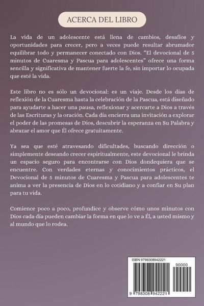 Profundice su fe en sólo 5 minutos al día: un viaje devocional para adolescentes "El Devocional de 5 minutos de Cuaresma y Pascua para adolescentes" es su guía de referencia para el crecimiento espiritual, diseñada específicamente para adolescentes que enfrentan los desafíos de la vida. Ya sea presión de grupo, relaciones o descubrir tu propósito, este devocional te permitirá acercarte más a Dios durante la temporada sagrada de Cuaresma y más allá. A través de temas identificables, versículos bíblicos inspiradores y reflexiones que invitan a la reflexión, este libro ofrece una forma práctica de fortalecer su fe en tan solo unos momentos al día. Experimente el viaje desde el Miércoles de Ceniza hasta la Semana de Pascua mientras cada entrada lo eleva y lo alienta a apoyarse en Dios a través de los altibajos de la vida. Dentro de este devocional para adolescentes: Reflexiones relevantes: al abordar desafíos de la vida real como la identidad, la ansiedad, las redes sociales, las amistades y la fe, este libro facilita a los adolescentes conectar las Escrituras con su vida cotidiana. Rápido y accesible: Cada devoción toma solo 5 minutos, perfecto para adolescentes que equilibran la escuela, los amigos y las actividades mientras siguen creciendo espiritualmente. Escrituras inspiradoras: versículos bíblicos cuidadosamente seleccionados combinados con exposiciones significativas para ayudar a los adolescentes a comprender y aplicar la Palabra de Dios en situaciones modernas. Poderosos inicios de oración: una oración simple al final de cada entrada ayuda a los adolescentes a abrir sus corazones a Dios y construir una conexión más profunda con Él. Ya sea que estés comenzando tu camino de fe o estés buscando fortalecerlo, este devocional te inspirará y te equipará para confiar en Dios, encontrar esperanza en Sus promesas y celebrar Su amor en cada aspecto de tu vida. Tómate el tiempo para crecer espiritualmente, un día a la vez, y descubre cómo la Palabra de Dios puede guiarte durante la Cuaresma y más allá.