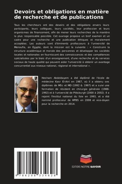Tous les chercheurs ont des devoirs et des obligations envers leurs participants, leurs collègues, leurs sociétés, leur profession et leurs organismes de financement, afin de mener leurs recherches de la manière la plus responsable possible. Cet ouvrage propose un bref examen et un cadre pour une recherche et une publication éthiques et moralement acceptées. Les auteurs sont d'éminents professeurs à l'université de Menoufia, en Égypte, dont la mission est la suivante : « Construire la structure académique et morale des personnes et développer les sociétés locales et nationales en fournissant des connaissances et des compétences spécialisées par le biais d'un enseignement, d'une recherche et de services sociaux de haute qualité qui peuvent aider l'université à obtenir un avantage concurrentiel aux niveaux national, régional et international ».