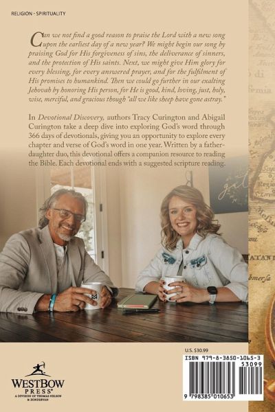 Can we not find a good reason to praise the Lord with a new song upon the earliest day of a new year? We might begin our song by praising God for His forgiveness of sins, the deliverance of sinners, and the protection of His saints. Next, we might give Him glory for every blessing, for every answered prayer, and for the fulfilment of His promises to humankind. Then we could go further in our exalting Jehovah by honoring His person, for He is good, kind, loving, just, holy, wise, merciful, and gracious though "all we like sheep have gone astray." In Devotional Discovery, authors Tracy Curington and Abigail Curington take a deep dive into exploring God's word through 366 days of devotionals, giving you an opportunity to explore every chapter and verse of God's word in one year. Written by a father-daughter duo, this devotional offers a companion resource to reading the Bible. Each devotional ends with a suggested scripture reading.