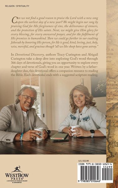 Can we not find a good reason to praise the Lord with a new song upon the earliest day of a new year? We might begin our song by praising God for His forgiveness of sins, the deliverance of sinners, and the protection of His saints. Next, we might give Him glory for every blessing, for every answered prayer, and for the fulfilment of His promises to humankind. Then we could go further in our exalting Jehovah by honoring His person, for He is good, kind, loving, just, holy, wise, merciful, and gracious though "all we like sheep have gone astray." In Devotional Discovery, authors Tracy Curington and Abigail Curington take a deep dive into exploring God's word through 366 days of devotionals, giving you an opportunity to explore every chapter and verse of God's word in one year. Written by a father-daughter duo, this devotional offers a companion resource to reading the Bible. Each devotional ends with a suggested scripture reading.