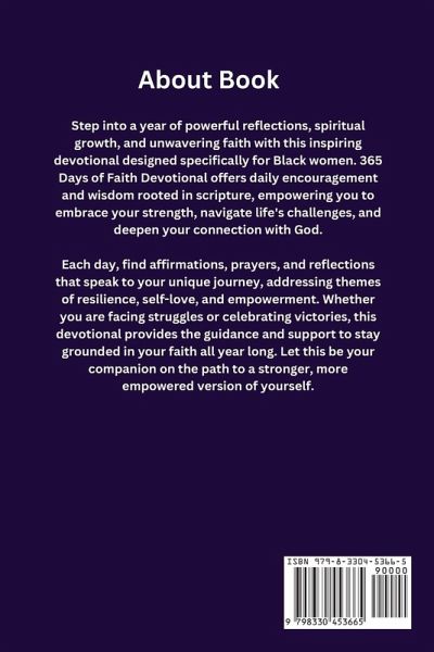 365 Days of Faith and Devotion for Black Women is your daily guide to deepening your faith, finding inner strength, and embracing spiritual renewal. Tailored specifically for the unique experiences of Black women, this year-long devotional offers empowering reflections that speak directly to your heart, your challenges, and your journey. Each devotion provides inspiration rooted in Scripture, uplifting reflections, and heartfelt prayers to encourage you to grow closer to God, even in the midst of life's demands. Whether you're navigating personal struggles, seeking encouragement for your dreams, or looking for peace in the daily grind, this devotional gives you the spiritual tools to strengthen your relationship with God and walk confidently in your purpose. With topics that reflect real-life experiences-such as balancing family, career, and self-care, overcoming setbacks, and cultivating joy- 365 Days of Faith and Devotion for Black Women speaks to the soul of every Black woman who seeks to thrive spiritually while embracing the power of God's grace and love. This book is not just a devotional; it's a journey toward renewal, resilience, and unwavering faith. Why this book will empower you:Daily Devotions that provide wisdom, comfort, and inspiration, helping you stay rooted in God's promises. Scripture-Based Reflections tailored to the realities of Black women's lives, offering strength and encouragement. Prayers and Affirmations that guide you through challenges, uplift your spirit, and keep you focused on God's plan for your life. A Journey of Renewal designed to deepen your faith and refresh your spirit, one day at a time. Start each day with a message of hope, draw closer to God, and discover the strength He has placed within you. 365 Days of Faith and Devotion for Black Women will help you embrace the empowered woman you were created to be-strong in faith, rich in purpose, and grounded in God's love. Transform your year. Transform your life.