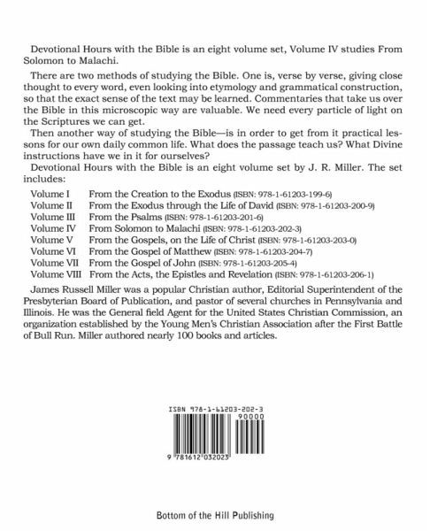 Devotional Hours with the Bible is an eight volume set, Volume IV studies From Solomon to Malachi. There are two methods of studying the Bible. One is, verse by verse, giving close thought to every word, even looking into etymology and grammatical construction, so that the exact sense of the text may be learned. Commentaries that take us over the Bible in this microscopic way are valuable. We need every particle of light on the Scriptures we can get. Then another way of studying the Bible-is in order to get from it practical lessons for our own daily common life. What does the passage teach us? What Divine instructions have we in it for ourselves? Devotional Hours with the Bible is an eight volume set by J. R. Miller. The set includes: Volume I From the Creation to the Exodus (ISBN: 978-1-61203-199-6) Volume II From the Exodus through the Life of David (ISBN: 978-1-61203-200-9) Volume III From the Psalms (ISBN: 978-1-61203-201-6) Volume IV From Solomon to Malachi (ISBN: 978-1-61203-202-3) Volume V From the Gospels, on the Life of Christ (ISBN: 978-1-61203-203-0) Volume VI From the Gospel of Matthew (ISBN: 978-1-61203-204-7) Volume VII From the Gospel of John (ISBN: 978-1-61203-205-4) Volume VIII From the Acts, the Epistles and Revelation (ISBN: 978-1-61203-206-1) James Russell Miller was a popular Christian author, Editorial Superintendent of the Presbyterian Board of Publication, and pastor of several churches in Pennsylvania and Illinois. He was the General field Agent for the United States Christian Commission, an organization established by the Young Men's Christian Association after the First Battle of Bull Run. Miller authored nearly 100 books and articles.
