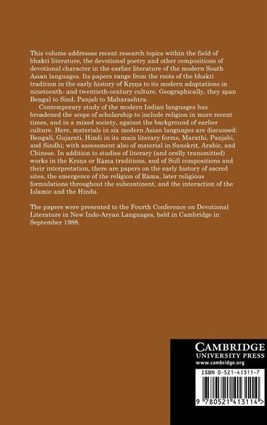 This volume addresses recent research topics within the field of Bhakti literature, the devotional poetry and other compositions of devotional character in the earlier literature of the modern South Asian languages. Its papers range from the roots of the Bhakti tradition in the early history of Krsna to its modern adaptations in nineteenth- and twentieth-century culture. Geographically, they span Bengal to Sind, Panjab to Maharashtra. Contemporary study of the modern Indian languages has broadened the scope of scholarship to consider today's Hindu attitudes, and those of a mixed society, against the background of ancient culture. Here, materials in six modern Asian languages are discussed: Bengali, Gujarati, Hindi in its main literary forms, Marathi, Panjabi, and Sindhi; with assessment also of material in Sanskrit, Arabic and Chinese. In addition to studies of literary (and orally transmitted) works in the Krsna or Rama traditions, and of Sufi compositions and their interpretation, there are papers on the early history of sacred sites, the emergence of the religion of Rama, later religious formulations throughout the subcontinent, and the interaction of the Islamic and the Hindu.