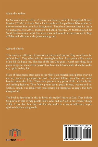 This book is a collection of personal and devotional poems. They come from the author's heart. They reflect what is meaningful to him. Each poem is like a piece of the life God gave me. The slice of life that God gives is worth recording. Each poem brings out some of the practical truths of the Christian life which the reader may apply to daily life. Many of these poems often came to me when I remembered some phrase or saying that my parents or grandparents used. The poems follow this order: first, some favorite poems that I like. Then come poems on my personal life, my family life, and making decisions. Then follow poems about special friends, teachers and co-workers. Finally, I conclude with some poems on theological concepts that have intrigued me. The book is devotional in that it directs the readers' hearts to God. They include Scripture and seek to help people follow God, and see God in the everyday things of life. I trust that these lines will lead the reader to a time of reflection, prayer, spiritual decision and growth.