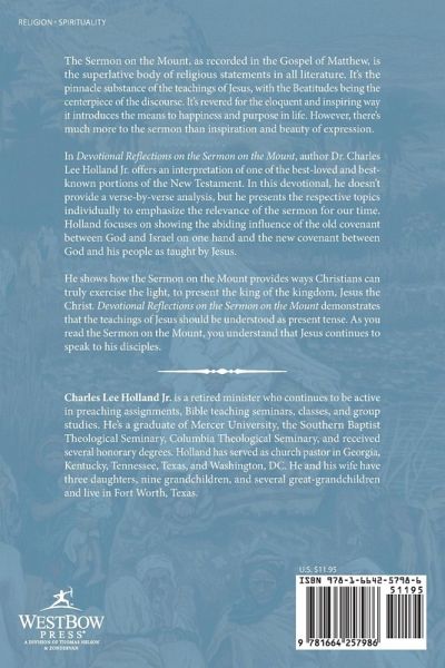 The Sermon on the Mount, as recorded in the Gospel of Matthew, is the superlative body of religious statements in all literature. It's the pinnacle substance of the teachings of Jesus, with the Beatitudes being the centerpiece of the discourse. It's revered for the eloquent and inspiring way it introduces the means to happiness and purpose in life. However, there's much more to the sermon than inspiration and beauty of expression. In Devotional Reflections on the Sermon on the Mount, author Dr. Charles Lee Holland Jr. offers an interpretation of one of the best-loved and best-known portions of the New Testament. In this devotional, he doesn't provide a verse-by-verse analysis, but he presents the respective topics individually to emphasize the relevance of the sermon for our time. Holland focuses on showing the abiding influence of the old covenant between God and Israel on one hand and the new covenant between God and his people as taught by Jesus. He shows how the Sermon on the Mount provides ways Christians can truly exercise the light, to present the king of the kingdom, Jesus the Christ. Devotional Reflections on the Sermon on the Mount demonstrates that the teachings of Jesus should be understood as present tense. As you read the Sermon on the Mount, you understand that Jesus continues to speak to his disciples.