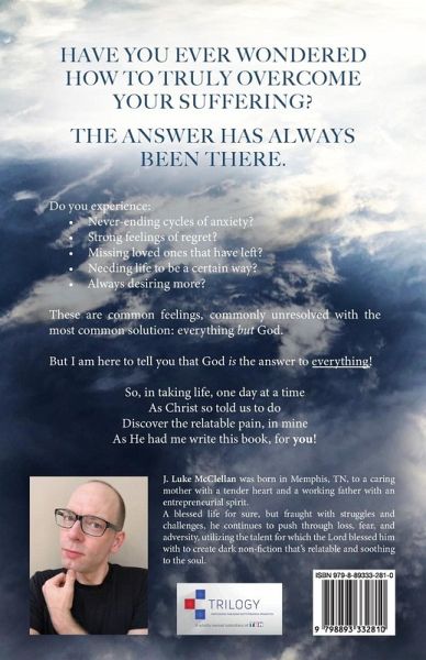 HAVE YOU EVER WONDERED HOW TO TRULY OVERCOME YOUR SUFFERING? THE ANSWER HAS ALWAYS BEEN THERE. Do you experience:Never-ending cycles of anxiety? Strong feelings of regret? Missing loved ones that have left? Needing life to be a certain way? Always desiring more? These are common feelings, commonly unresolved with the most common solution: everything but God. But I am here to tell you that God is the answer to everything! So, in taking life, one day at a time As Christ so told us to do Discover the relatable pain, in mine As He had me write this book, for you!