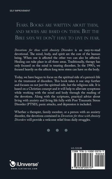 FEARS. BOOKS ARE WRITTEN ABOUT THEM, AND MOVIES ARE BASED ON THEM. BUT THE BIBLE SAYS WE DON'T HAVE TO LIVE IN FEAR. Devotions for those with Anxiety Disorders is an easy-to-read devotional. The mind, body, and spirit are the core of the human being. When one is affected the other two can also be affected. Healing can take place in all three areas. Traditionally, therapy has only focused on the mind in treating disorders. In the 1990's, we focused heavily on the affects long term stress can have on the body. Today, we have begun to focus on the spiritual side of a person's life in the treatment of disorders. This book takes it one step further and focuses on not just the spiritual side, but the religious side. It is based on a Christian concept and it will help to alleviate symptoms while working with the mind and body through the reading of the devotions. Along with the scriptures, practical advice about living with anxiety and living life fully with Post Traumatic Stress Disorder (PTSD), panic attacks, and depression is included. Whether a therapist, family member, or a person with an anxiety disorder, the devotions contained in Devotions for those with Anxiety Disorders will provide a welcome relief from daily struggles.