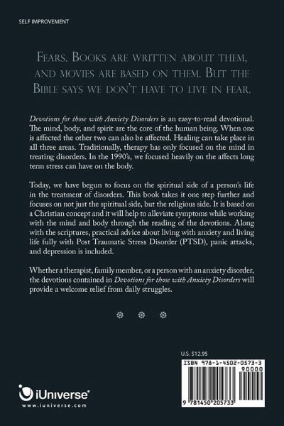 FEARS. BOOKS ARE WRITTEN ABOUT THEM, AND MOVIES ARE BASED ON THEM. BUT THE BIBLE SAYS WE DON'T HAVE TO LIVE IN FEAR. Devotions for those with Anxiety Disorders is an easy-to-read devotional. The mind, body, and spirit are the core of the human being. When one is affected the other two can also be affected. Healing can take place in all three areas. Traditionally, therapy has only focused on the mind in treating disorders. In the 1990's, we focused heavily on the affects long term stress can have on the body. Today, we have begun to focus on the spiritual side of a person's life in the treatment of disorders. This book takes it one step further and focuses on not just the spiritual side, but the religious side. It is based on a Christian concept and it will help to alleviate symptoms while working with the mind and body through the reading of the devotions. Along with the scriptures, practical advice about living with anxiety and living life fully with Post Traumatic Stress Disorder (PTSD), panic attacks, and depression is included. Whether a therapist, family member, or a person with an anxiety disorder, the devotions contained in Devotions for those with Anxiety Disorders will provide a welcome relief from daily struggles.