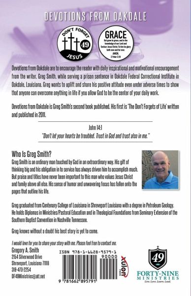 Devotions from Oakdale are to encourage the reader with daily inspirational and motivational encouragement from the writer, Greg Smith, while serving a prison sentence in Oakdale Federal Correctional Institute in Oakdale, Louisiana. Greg wants to uplift and share his positive attitude even under adverse times to show that anyone can overcome anything in life if you allow God to be the center of your daily walk. Who is Greg Smith? Greg Smith is an ordinary man touched by God in an extraordinary way. His gift of thinking big and his obligation to serve has always driven him to accomplish much. But praise and titles have never been important to this man who values Jesus Christ and family above all else. His sense of humor and unwavering focus has fallen onto the pages that outline his life. Greg graduated from Centenary College of Louisiana in Shreveport, Louisiana with a degree in Petroleum Geology. He holds Diplomas in Ministries/Pastoral Education and in Theological Foundations from Seminary Extension of the Southern Baptist Convention in Nashville, Tennessee. Greg know without a doubt his best story is yet to come. I would love for you to share your story. Please feel free to contact me. 318-621-6529 df49ministries@yahoo.com