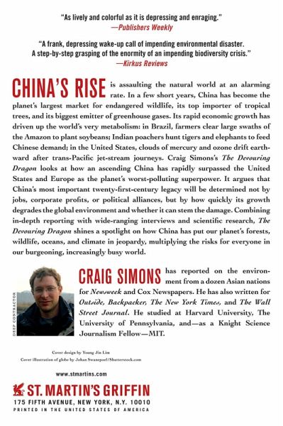 China's rise is assaulting the natural world at an alarming rate. In a few short years, China has become the planet's largest market for endangered wildlife, its top importer of tropical trees, and its biggest emitter of greenhouse gases. Its rapid economic growth has driven up the world's very metabolism: in Brazil, farmers clear large swaths of the Amazon to plant soybeans; Indian poachers hunt tigers and elephants to feed Chinese demand; in the United States, clouds of mercury and ozone drift earthward after trans-Pacific jet-stream journeys. Craig Simons' The Devouring Dragon looks at how an ascending China has rapidly surpassed the U.S. and Europe as the planet's worst-polluting superpower. It argues that China's most important 21st-century legacy will be determined not by jobs, corporate profits, or political alliances, but by how quickly its growth degrades the global environment and whether it can stem the damage. Combining in-depth reporting with wide-ranging interviews and scientific research, The Devouring Dragon shines a spotlight on how China has put our planet's forests, wildlife, oceans, and climate in jeopardy, multiplying the risks for everyone in our burgeoning, increasingly busy world.