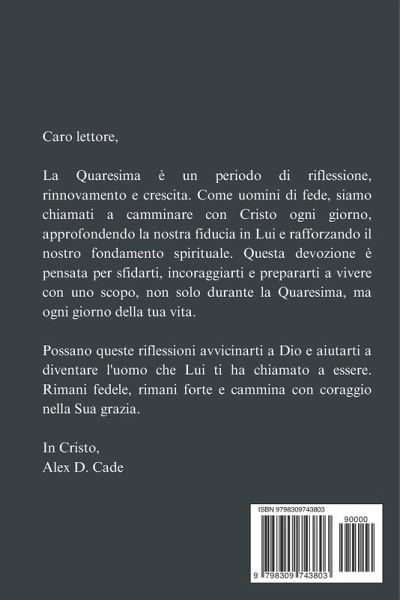 Rafforza la tua fede.Guidare con uno scopo.Cammina nel potere di Cristo. La Quaresima è più di una stagione: è una chiamata ad avvicinarsi a Dio, sviluppare resilienza spirituale e abbracciare la forza che deriva da una vita completamente arresa a Cristo. Come uomo di fede, sei chiamato a guidare, servire e rimanere saldo in un mondo che sfida costantemente le tue convinzioni. Questo Devozionale di 40 giorni è progettato per equipaggiare, incoraggiarti e sfidarti a camminare con coraggio nella tua fede, non solo durante la Quaresima, ma ogni giorno della tua vita. Ogni giorno sarai guidato attraverso: Una preghiera di apertura - Inizia la tua giornata invitando la presenza di Dio. Una lettura della Scrittura - Ancora il tuo cuore e la tua mente alla Parola di Dio. Un'esposizione - Ottieni spunti pratici su come applicare il passaggio alla tua vita. Incoraggiamento - Ricordati della tua identità e forza in Cristo. Una preghiera di chiusura - Concludere con gratitudine e fiducia nel disegno di Dio. Camminare nella fede - Un passo semplice e attuabile per aiutarti a vivere la tua fede ogni giorno. Questo devozionale è scritto specificatamente per gli uomini-uomini che desiderano crescere spiritualmente, condurre bene la propria famiglia, onorare Dio nel loro lavoro e restare saldi nelle proprie convinzioni. Esplorerai temi potenti come fede sotto pressione, virilità biblica, resistenza alla tentazione, guida con integrità e trovare forza nell'arrendersi. Perché questo devozionale? ✔ Radicato nella Bibbia e pratico - Ogni riflessione si fonda sulla Scrittura e parla direttamente alle sfide che gli uomini affrontano oggi. ✔ Incoraggiamento quotidiano - Letture brevi e potenti progettate per tenerti impegnato, anche in un programma fitto di appuntamenti. ✔ Per ogni uomo - Che tu sia un marito, un padre, un leader o semplicemente un uomo che cerca di crescere nella sua fede, questa devozione è per te. ✔ Perfetto per lo studio personale o di gruppo - Usalo da solo o come guida per studi biblici maschili o piccoli gruppi. Oltre la Quaresima: una vita con uno scopo La Quaresima è solo l'inizio. Questa devozione ti aiuterà a coltivare una fede che duri oltre questi 40 giorni, dotandosi di ciò guida con coraggio, ama profondamente e vivi con fede incrollabile. Sei pronto ad accettare la sfida? Inizia oggi il tuo viaggio di 40 giorni e sperimenta la trasformazione che avviene quando cammini nella forza di Cristo.