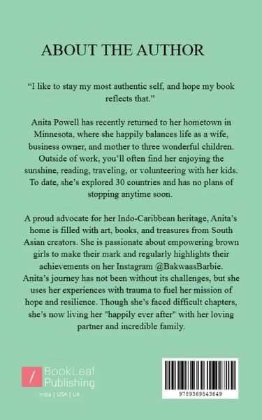 A proud advocate for her Indo-Caribbean heritage, Anita's home is filled with art, books, and treasures from South Asian creators. She is passionate about empowering brown girls to make their mark and regularly highlights their achievements on her Instagram @BakwaasBarbie. Anita's journey has not been without its challenges, but she uses her experiences with trauma to fuel her mission of hope and resilience. Though she's faced difficult chapters, she's now living her ""happily ever after"" with her loving partner and incredible family.