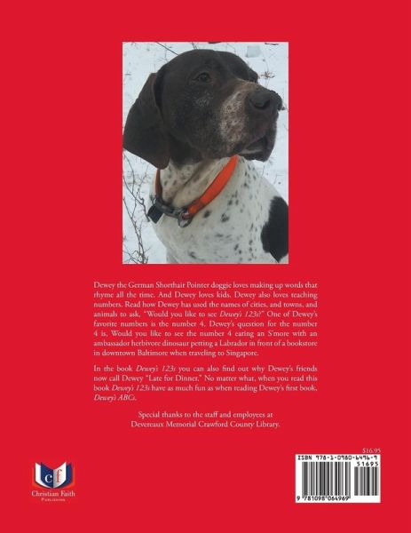 Dewey the German Shorthair Pointer doggie loves making up words that rhyme all the time. And Dewey loves kids. Dewey also loves teaching numbers. Read how Dewey has used the names of cities, and towns, and animals, to ask, "Would you like to see Dewey's 123s?" One of Dewey's favorite numbers is the number 4. Dewey's question for the number 4 is, Would you like to see the number 4 eating an S'more with an ambassador and a herbivore dinosaur while petting a Labrador in front of a bookstore in downtown Baltimore when traveling to Singapore? In the book Dewey's 123s you can also find out why Dewey's friends now call Dewey "Late for Dinner." No matter what, when you read this book Dewey's 123s have as much fun as reading Dewey's first book; Dewey's ABCs. Special thanks to the staff and employees at Devereaux Memorial Crawford County Library.