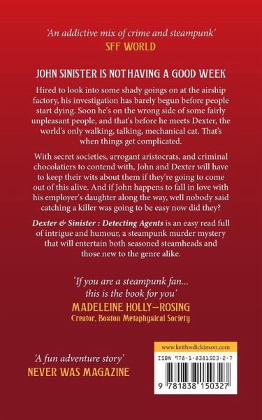 John Sinister is not having a good week. Hired to look into some shady goings on at the airship factory, his investigation has barely begun before people start dying. Soon he's on the wrong side of some fairly unpleasant people, and that's before he meets Dexter, the world's only walking, talking, mechanical cat. That's when things get complicated. With secret societies, arrogant aristocrats, and criminal chocolatiers to contend with, John and Dexter will have to keep their wits about them if they're going to come out of this alive. And if John happens to fall in love with his employer's daughter along the way, well nobody said catching a killer was going to be easy now did they?