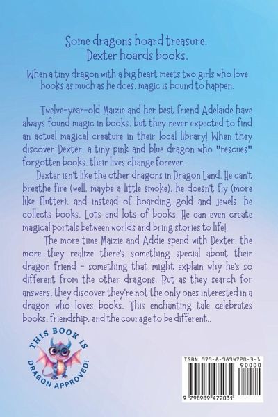 What happens when two Bookworms meet a Book Dragon who loves books even more than they do? Magic, adventure, and a friendship that will change three lives forever. Twelve-year-old Maizie and her best friend Adelaide have always found magic in books, but they never expected to find an actual magical creature in their local library! When they discover Dexter, a tiny pink and blue dragon who "rescues" forgotten books, their lives change forever. Dexter isn't like the other dragons in Dragon Land. He can't breathe fire (well, maybe a little smoke), he doesn't fly (more like flutter), and instead of hoarding gold and jewels, he collects books. Lots and lots of books. The girls quickly learn that Dexter can create magical portals between worlds and even bring stories to life! The more time Maizie and Addie spend with Dexter, the more they realize there's something special about their dragon friend - something that might explain why he's so different from the other dragons. But as they search for answers, they discover they're not the only ones interested in a dragon who loves books. Are you looking for a book that entertains while encouraging a love of reading? Meet Dexter, a gentle dragon who shows children that being different is a gift, libraries are magical places, and true friendship knows no bounds. This heartwarming adventure celebrates reading, kindness, and the courage to be yourself. Perfect for fans of dragon stories and those who know that not all treasures are gold and jewels - some treasures are found in much-loved and yet to be discovered stories - will love Dexter the Book Dragon!