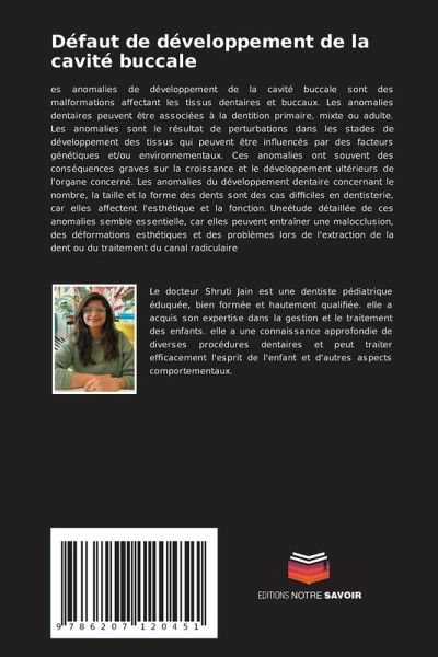 es anomalies de développement de la cavité buccale sont des malformations affectant les tissus dentaires et buccaux. Les anomalies dentaires peuvent être associées à la dentition primaire, mixte ou adulte. Les anomalies sont le résultat de perturbations dans les stades de développement des tissus qui peuvent être influencés par des facteurs génétiques et/ou environnementaux. Ces anomalies ont souvent des conséquences graves sur la croissance et le développement ultérieurs de l'organe concerné. Les anomalies du développement dentaire concernant le nombre, la taille et la forme des dents sont des cas difficiles en dentisterie, car elles affectent l'esthétique et la fonction. Uneétude détaillée de ces anomalies semble essentielle, car elles peuvent entraîner une malocclusion, des déformations esthétiques et des problèmes lors de l'extraction de la dent ou du traitement du canal radiculaire