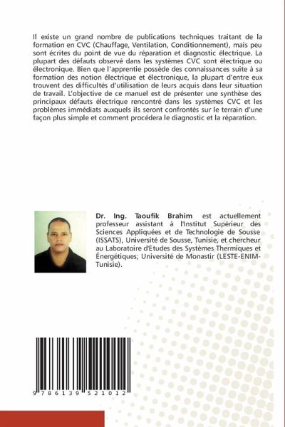 Il existe un grand nombre de publications techniques traitant de la formation en CVC (Chauffage, Ventilation, Conditionnement), mais peu sont écrites du point de vue du réparation et diagnostic électrique. La plupart des défauts observé dans les systèmes CVC sont électrique ou électronique. Bien que l'apprentie possède des connaissances suite à sa formation des notion électrique et électronique, la plupart d'entre eux trouvent des difficultés d'utilisation de leurs acquis dans leur situation de travail. L'objective de ce manuel est de présenter une synthèse des principaux défauts électrique rencontré dans les systèmes CVC et les problèmes immédiats auxquels ils seront confrontés sur le terrain d'une façon plus simple et comment procédera le diagnostic et la réparation.