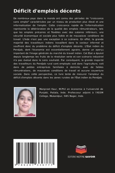 De nombreux pays dans le monde ont connu des périodes de "croissance sans emploi" caractérisées par un niveau de production plus élevé et une informalisation de l'emploi. Cette croissance rapide de l'informalisation représente la détérioration de la qualité des emplois rémunérateurs, tels que les emplois précaires et flexibles avec des salaires inférieurs, une sécurité économique et sociale plus faible et de mauvaises conditions de travail. L'Inde n'est pas une exception à ce scénario. En effet, la grande majorité des travailleurs indiens travaillent dans le secteur informel et souffrent donc du problème du déficit d'emplois décents. L'État indien du Pendjab, dont l'économie est essentiellement agraire, donne un aperçu important de l'image générale du marché du travail indien. Cet État a épuisé depuis longtemps les fruits de la révolution verte et son scénario industriel n'a pas évolué dans le sens souhaité. Par conséquent, la grande majorité des travailleurs du Pendjab rural sont employés soit dans l'agriculture, soit dans de petites entreprises familiales à domicile, avec de faibles rémunérations, de mauvaises conditions de travail et aucune couverture sociale. Dans cette perspective, ce livre tente de mesurer l'ampleur du déficit d'emplois décents dans les zones rurales de l'État indien du Pendjab.