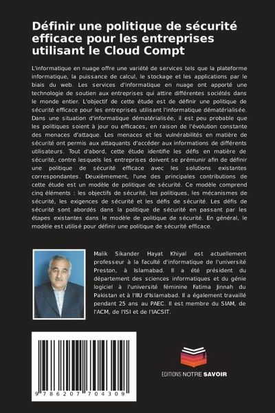 L'informatique en nuage offre une variété de services tels que la plateforme informatique, la puissance de calcul, le stockage et les applications par le biais du web. Les services d'informatique en nuage ont apporté une technologie de soutien aux entreprises qui attire différentes sociétés dans le monde entier. L'objectif de cette étude est de définir une politique de sécurité efficace pour les entreprises utilisant l'informatique dématérialisée. Dans une situation d'informatique dématérialisée, il est peu probable que les politiques soient à jour ou efficaces, en raison de l'évolution constante des menaces d'attaque. Les menaces et les vulnérabilités en matière de sécurité ont permis aux attaquants d'accéder aux informations de différents utilisateurs. Tout d'abord, cette étude identifie les défis en matière de sécurité, contre lesquels les entreprises doivent se prémunir afin de définir une politique de sécurité efficace avec les solutions existantes correspondantes. Deuxièmement, l'une des principales contributions de cette étude est un modèle de politique de sécurité. Ce modèle comprend cinq éléments : les objectifs de sécurité, les politiques, les mécanismes de sécurité, les exigences de sécurité et les défis de sécurité. Les défis de sécurité sont abordés dans la politique de sécurité en passant par les étapes existantes dans le modèle de politique de sécurité. En général, le modèle est utilisé pour définir une politique de sécurité efficace.