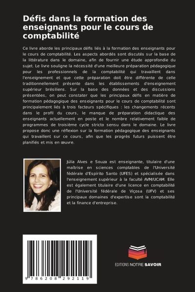 Ce livre aborde les principaux défis liés à la formation des enseignants pour le cours de comptabilité. Les aspects abordés sont discutés sur la base de la littérature dans le domaine, afin de fournir une étude approfondie du sujet. Le livre souligne la nécessité d'une meilleure préparation pédagogique pour les professionnels de la comptabilité qui travaillent dans l'enseignement et que cette préparation doit être différente de celle traditionnellement présente dans les établissements d'enseignement supérieur brésiliens. Sur la base des données et des discussions présentées, on peut constater que les principaux défis en matière de formation pédagogique des enseignants pour le cours de comptabilité sont principalement liés à trois facteurs spécifiques : les changements récents dans le profil du cours, le manque de préparation didactique des enseignants actuellement en poste et le nombre relativement faible de programmes de troisième cycle stricto sensu dans le domaine. Le livre propose donc une réflexion sur la formation pédagogique des enseignants qui travaillent sur ce cours, afin que les progrès futurs puissent être planifiés et mis en oeuvre.