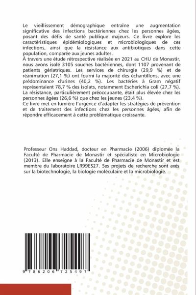 Le vieillissement démographique entraîne une augmentation significative des infections bactériennes chez les personnes âgées, posant des défis de santé publique majeurs. Ce livre explore les caractéristiques épidémiologiques et microbiologiques de ces infections, ainsi que la résistance aux antibiotiques dans cette population, comparée aux jeunes adultes.À travers une étude rétrospective réalisée en 2021 au CHU de Monastir, nous avons isolé 3105 souches bactériennes, dont 1107 provenant de patients gériatriques. Les services de chirurgie (29,9 %) et de réanimation (27,1 %) ont fourni la majorité des échantillons, avec une prédominance d'urines (40,2 %). Les bactéries à Gram négatif représentaient 78,7 % des isolats, notamment Escherichia coli (27,7 %). La résistance, particulièrement préoccupante, était plus élevée chez les personnes âgées (26,6 %) que chez les jeunes (23,4 %).Ce livre met en lumière l'urgence d'adapter les stratégies de prévention et de traitement des infections chez les personnes âgées, afin de répondre efficacement à cette problématique croissante.