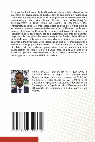 Comprendre l'influence de la dégradation de la voirie urbaine sur le processus de développement durable dans la commune de Ngaoundéré 2ème dans un contexte de crise de l'Etat-providence camerounais est la problématique de cette étude. Il est sans ambiguïté qu'un développement à long terme ne saurait se concrétiser sans infrastructures routières praticables. L'état dégradé de la voirie urbaine se présente cependant comme le résultat de la combinaison des facteurs naturels liés aux vieillissements et aux conditions climatiques, de l'ignorance de la population, des comportements déviants qui prennent corps dans la corruption, les détournements des fonds publics alloués à la réhabilitation de la voirie urbaine et des jeux de pouvoir au sein des autorités administratives. Cette dégradation agit par conséquent sur le Bien-être de la population à travers la prolifération des accidents de circulation et des maladies pulmonaires tout en conduisant à la paupérisation de celle-ci suite à l'usure précoce des véhicules et la baisse du pouvoir entrepreneurial dans le milieu, donnant ainsi au développement durable le statut de mort-né.