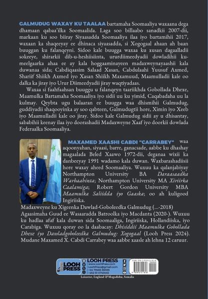 Galmudug waxay ku taalaa bartamaha Soomaaliya waxaana dega dhamaan qabaa'ilka Soomaalida. Laga soo billaabo sanadkii 2007-dii, markaan ku soo biiray Siyaasadda Soomaaliya ilaa iyo bartamihii 2017, waxaan ka shaqeeyay ee dhinaca siyaasadda, si Xogogaal ahaan ah baan buuggan ku falanqeyni. Sidoo kale buugga waxaa ku xusan dagaalladii sokeeye, shirarkii dib-u-heshiisiinta, ururdiimeedyadii dowladihii ku-meelgaarka ahaa ee ay kala hoggaaminayeen madaxweynayaashii kala duwanaa sida; Cabdiqaasim Salaad Xasan, Cabdulaahi Yuusuf Axmed, Shariif Shiikh Axmed iyo Xasan Shiikh Maxamuud, Maamulladii kale oo dalka ka jiray iyo Urur Diimeedyadii jiray waqtiyadaas. Waxaa si faahfaahsan buuggu u falanqeyn taariikhda Gobollada Dhexe, Maamulka Bartamaha Soomaaliya iyo sidii uu ku yimid, Caqabadaha uu la kulmay. Qeybta ugu balaaran ee buugga waa dhismihii Galmudug, guddiyadii shaqooyinka ay soo qabteen, Galmudugtii hore, Ximin iyo Xeeb iyo Maamulladii kale oo jiray. Sidoo kale Galmudug sidii ay u dhisantay, sababihii keenay ilaa iyo doorashadii Madaxweyne Xaaf iyo doorkii dowlada Federaalka Soomaaliya. Maxamed Xaashi Cabdi "Carrabey" waa aqoonyahan, siyaasi, barre, ganacsade, aabbe ku dhashay magaalada Beled Xaawo 1972-dii, deganaa wixii ka danbeeyay 1991 wadamo kala duwan. Waxbarashadiisii hore waxay aheed Soomaaliya. Wuxuu ka qalanjabiyay Northampton University BA Daraasaadka Warbaahinta; Northampton University MA Xiriirka Caalamiga; Robert Gordon University MBA Maamulka Saliidda iyo Gaaska; oo ah kuligood Ingiriiska. Madaxweyne ku Xigeenka Dawlad-Goboleedka Galmudug (...-2018). Agaasimaha Guud ee Wasaaradda Batroolka iyo Macdanta (2020-). Wuxuu ku hadlaa afaf kala duwan sida Soomaaliga, Ingiriiska, Hollandiiska, iyo Carabiga. Wuxuu qoray oo la daabacay: Dhisiddii Maamulka Gobollada Dhexe iyo Dawladgoboleedka Galmudug: Xogogaal (Looh Press 2024). Mudane Maxamed X. Cabdi Carrabey waa aabbe xaasle ah lehna 12 caruur.