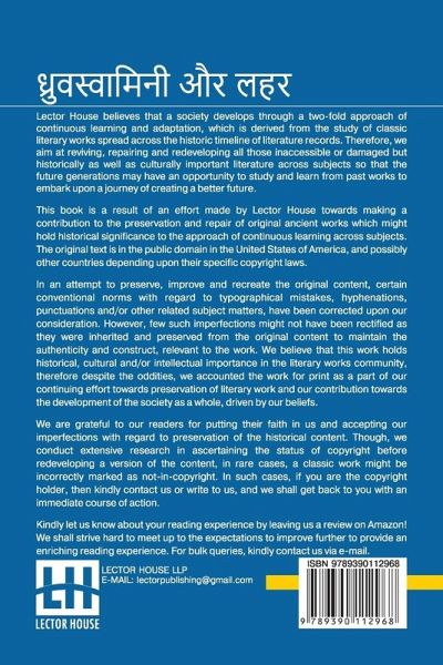 Dhruvswamini Aur Lahar This book is a result of an effort made by us towards making a contribution to the preservation and repair of original classic literature. In an attempt to preserve, improve and recreate the original content, we have worked towards: 1. Type-setting & Reformatting: The complete work has been re-designed via professional layout, formatting and type-setting tools to re-create the same edition with rich typography, graphics, high quality images, and table elements, giving our readers the feel of holding a 'fresh and newly' reprinted and/or revised edition, as opposed to other scanned & printed (Optical Character Recognition - OCR) reproductions. 2. Correction of imperfections: As the work was re-created from the scratch, therefore, it was vetted to rectify certain conventional norms with regard to typographical mistakes, hyphenations, punctuations, blurred images, missing content/pages, and/or other related subject matters, upon our consideration. Every attempt was made to rectify the imperfections related to omitted constructs in the original edition via other references. However, a few of such imperfections which could not be rectified due to intentional\unintentional omission of content in the original edition, were inherited and preserved from the original work to maintain the authenticity and construct, relevant to the work. We believe that this work holds historical, cultural and/or intellectual importance in the literary works community, therefore despite the oddities, we accounted the work for print as a part of our continuing effort towards preservation of literary work and our contribution towards the development of the society as a whole, driven by our beliefs. We are grateful to our readers for putting their faith in us and accepting our imperfections with regard to preservation of the historical content. HAPPY READING!