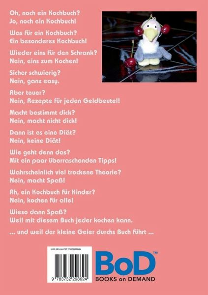 Oh, noch ein Kochbuch? Jo, noch ein Kochbuch!Was für ein Kochbuch?Ein besonderes Kochbuch!Wieder eins für den Schrank?Nein, eins zum Kochen!Sicher schwierig?Nein, ganz easy.Aber teuer?Nein, Rezepte für jeden Geldbeutel!Macht bestimmt dick?Nein, macht nicht dick!Dann ist es eine Diät?Nein, keine Diät!Wie geht denn das?Mit ein paar überraschenden Tipps!Wahrscheinlich viel trockene Theorie?Nein, macht Spaß!Ah, ein Kochbuch für Kinder?Nein, kochen für alle!Wieso dann Spaß?Weil mit diesem Buch jeder kochen kann.... und weil der kleine Geier durchs Buch führt ...