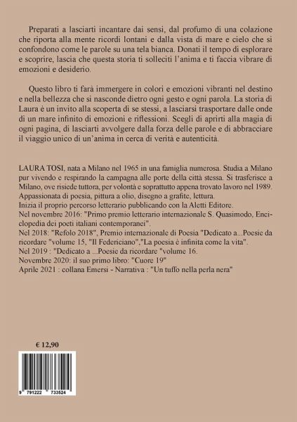 Laura è una donna dall'animo vulnerabile e dalla mente fervidamente creativa, che si muove attraverso le complessità della vita con forza d'animo e un desiderio insaziabile di comprensione profonda. La sua storia si snoda attraverso difficoltà, incidenti, incontri significativi, e riflessioni intime che, come frammenti di vetro colorato, compongono il mosaico della vita di Laura. Dal profondo legame con la natura alla sua battaglia contro un ictus, ogni pagina rivela la ricerca incessante di una luce capace di guidare attraverso la notte della solitudine e del dubbio. In un dialogo continuo tra il mondo interiore ed esteriore, Laura esplora i sentieri dell'amore, della perdita, della resilienza e del rinnovamento. Il suo è un viaggio tra le ombre e le luci dell'esistenza, dove i momenti di profonda connessione con il creato diventano fonte di ispirazione e riscatto. Il mare e il cielo, il sole e la luna, le buganvillee e i silenzi colmi di parole non dette: tutto parla, tutto ha significato. In questo libro dietro ogni gesto, ogni pensiero, ogni emozione, si nasconde un universo di possibilità e di speranza. È una testimonianza di come, anche nei momenti di maggiore fragilità, l'essere umano possa elevarsi alla ricerca di un orizzonte più ampio, guidato dalla forza incrollabile dell'amore e della bellezza che risiedono in ogni frammento della vita.