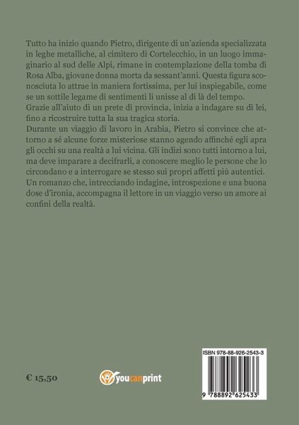 Tutto ha inizio quando Pietro, dirigente di un'azienda specializzata in leghe metalliche, al cimitero di Cortelecchio, in un luogo immaginario al sud delle Alpi, rimane in contemplazione della tomba di Rosa Alba, giovane donna morta da sessant'anni. Questa figura sconosciuta lo attrae in maniera fortissima, per lui inspiegabile, come se un sottile legame di sentimenti li unisse al di là del tempo. Grazie all'aiuto di un prete di provincia, inizia a indagare su di lei, fino a ricostruire tutta la sua tragica storia. Durante un viaggio di lavoro in Arabia, Pietro si convince che attorno a sé alcune forze misteriose stanno agendo affinché egli apra gli occhi su una realtà a lui vicina. Gli indizi sono tutti intorno a lui, ma deve imparare a decifrarli, a conoscere meglio le persone che lo circondano e a interrogare se stesso sui propri affetti più autentici. Un romanzo che, intrecciando indagine, introspezione e una buona dose d'ironia, accompagna il lettore in un viaggio verso un amore ai confini della realtà.