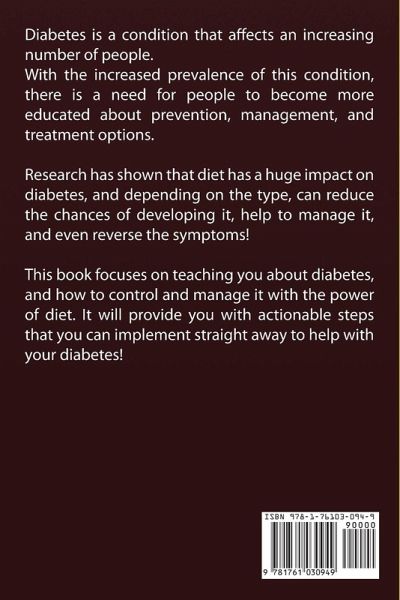 DIABETES DIET Diabetes is a condition that affects an increasing number of people. With the increased prevalence of this condition, there is a need for people to become more educated about prevention, management, and treatment options. Research has shown that diet has a huge impact on diabetes, and depending on the type, can reduce the chances of developing it, help to manage it, and even reverse the symptoms! This book focuses on teaching you about diabetes, and how to control and manage it with the power of diet. It will provide you with actionable steps that you can implement straight away to help with your diabetes! Stop suffering, and do something about your condition today with the help of this book! Here Is What You'll Learn About... What Is Diabetes Types Of Diabetes Symptoms & Diagnosis What To Avoid What Foods To Include Meal Plans & Suggestions How To Avoid Temptations & Stay On Track Much, Much More!
