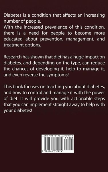 DIABETES DIET Diabetes is a condition that affects an increasing number of people. With the increased prevalence of this condition, there is a need for people to become more educated about prevention, management, and treatment options. Research has shown that diet has a huge impact on diabetes, and depending on the type, can reduce the chances of developing it, help to manage it, and even reverse the symptoms! This book focuses on teaching you about diabetes, and how to control and manage it with the power of diet. It will provide you with actionable steps that you can implement straight away to help with your diabetes! Stop suffering, and do something about your condition today with the help of this book! Here Is What You'll Learn About... What Is Diabetes Types Of Diabetes Symptoms & Diagnosis What To Avoid What Foods To Include Meal Plans & Suggestions How To Avoid Temptations & Stay On Track Much, Much More!
