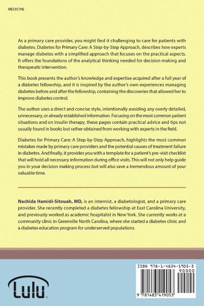 As a primary care provider, you might find it challenging to care for patients with diabetes. Diabetes for Primary Care: A Step-by-Step Approach, describes how experts manage diabetes with a simplified approach that focuses on the practical aspects. This book presents the author's knowledge and expertise acquired after a full year of a diabetes fellowship, and it is inspired by the author's own experiences managing diabetes before and after the fellowship, containing the discoveries that allowed her to improve diabetes control. Diabetes for Primary Care: A Step-by-Step Approach, highlights the most common mistakes made by primary care providers and the potential causes of treatment failure in diabetes. And finally, it provides you with a template for a patient's pre-visit checklist that will hold all necessary information during office visits. This will not only help guide you in your decision making process but will also save a tremendous amount of your valuable time.