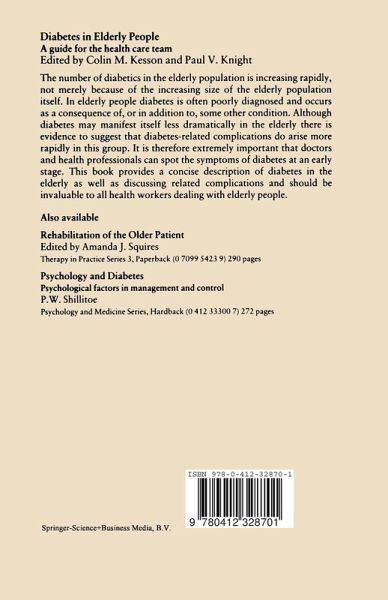 This book is intended for all members of the health care team who look after elderly people with diabetes mellitus. This includes specialist nurses in diabetes and care of the elderly, other nurses who might be involved with elderly diabetic patients, hospital doctors, general practitioners, dietitians, and other paramedical staff as well as students in these various disciplines. It is not an exhaustive text, but includes plenty of back ground references for those who wish to pursue a topic further. FOREWORD It has been said that old age is not so bad when you consider the alternative; but, fortunately on occasion symptoms attri buted to ageing are due to treatable disease. This useful book draws attention to diabetes mellitus, a common illness in elderly people, which can cause serious disability and should be diagnosed promptly and treated correctly. In this text the facts are well documented that the diagnosis may alarm old people and thus a full explanation must be given and the likely benefits of an adequate therapeutic regimen described. Drs Paul Knight and Colin Kesson are physicians intimately concerned with the day to day diagnosis and treatment of diabetes and they have enlisted the assistance of colleagues of outstanding ability, thus demonstrating the vital importance of teamwork in the control of this disease.