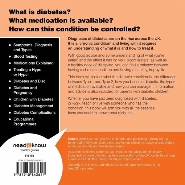 Diagnoses of diabetes are on the rise across the UK. It is a 'chronic condition' and living with it requires an understanding of what it is and how to treat it. With good advice, some understanding of what you're eating and the effect it has on your blood sugars, as well as a healthy dose of discipline, you can find a balance between having a chronic condition and having a happy, healthy life. This book looks at what the diabetic condition is, the difference between Type 1 and Type 2, how you become diabetic, the types of medication available and how you can manage it. Information and advice is also included for parents with diabetic children. Whether you have just been diagnosed with diabetes, or work, teach or live with someone who has the condition, this book will arm you with all the essential facts you need to know about the condition. Clear concise step-by-step guide. Includes detailed help list.