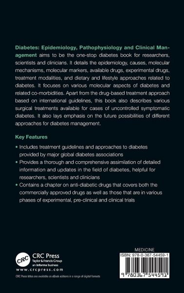 Diabetes: Epidemiology, Pathophysiology and Clinical Management aims to be the one-stop diabetes book for researchers, scientists and clinicians. It details the epidemiology, causes, molecular mechanisms, molecular markers, available drugs, experimental drugs, treatment modalities, and dietary and lifestyle approaches related to diabetes. It focuses on various molecular aspects of diabetes, and its related co-morbidities. Apart from the drug-based treatment approach based on international guidelines, this book also describes various surgical treatments available for cases of uncontrolled symptomatic diabetes. It also lays emphasis on the future possibilities of different approaches for diabetes management. Key Features Includes treatment guidelines and approaches to diabetes provided by major global diabetes associations Provides a thorough and comprehensive assimilation of detailed information and updates in the field of diabetes, helpful for researchers, scientists and clinicians Contains a chapter on anti-diabetic drugs, that covers both the commercially approved drugs as well as those that are in various phases of experimental, pre-clinical, and clinical trials