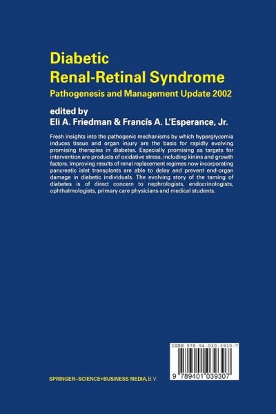 1. Effect of Aminoguanidine on Induced-diabetic Rabbits and Diabetic Patients with ESRD.- 2. Impact of Nutrition in Uremic Diabetics.- 3. New Insights into the Molecular Mechanisms of Vascular Permeability in Diabetes.- 4. Apoptosis and Neurodegeneration in Diabetes: Lessons From the Retina.- 5. Diabetic Macular Edema.- 6. Diabetic Vitrectomy Update.- 7. Medical Approaches to Preventing Vision Loss from Diabetic Retinopathy.- 8. Ocular Findings at Onset of Uremia.- 9. Proliferative Diabetic Retinopathy: Current Treatment Strategies for Progression.- 10. Microalbuminuria in Perspectives.- 11. Which Comes First: Renal Injury or Microalbuminuria?.- 12. Prevention, Diagnosis and Management of Heart Disease in Patients with Renal Failure.- 13. Reducing Mortality for Diabetes Patients on Hemodialysis.- 14. Long-Term Perspective on Utility of Peritoneal Dialysis in Diabetes.- 15. Complications of Post-transplant Diabetes.- 16. Prevalent US Transplant Center Policies Towards Pancreas Transplantation for Patients with Type 2 Diabetes Mellitus.- 17. Pancreas Transplantation: Does It Have a Future?.- 18. Novel Applications for Recombinant Human Erythropoietin.- 19. Lessons Learned Since the Last Renal-Retinal Conference.