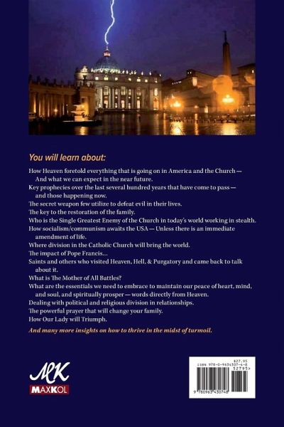 You will learn about:How Heaven foretold everything that is going on in America and the Church - And what we can expect in the near future. Key prophecies over the last several hundred years that have come to pass - and those happening now. The secret weapon few utilize to defeat evil in their lives. The key to the restoration of the family. Who is the Single Greatest Enemy of the Church in today's world working in stealth. How socialism/communism awaits the USA - Unless there is an immediate amendment of life. Where division in the Catholic Church will bring the world. The impact of Pope Francis... Saints and others who visited Heaven, Hell, & Purgatory and came back to talk about it. What is The Mother of All Battles? What are the essentials we need to embrace to maintain our peace of heart, mind, and soul, and spiritually prosper - words directly from Heaven. Dealing with political and religious division in relationships. The powerful prayer that will change your family. How Our Lady will Triumph. And many more insights on how to thrive in the midst of turmoil.