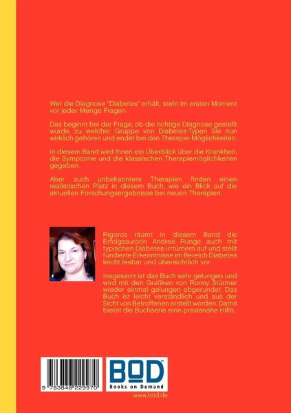 Wer die Diagnose "Diabetes" erhält, steht im ersten Moment vor jeder Menge Fragen.Das beginnt bei der Frage, ob die richtige Diagnose gestellt wurde, zu welcher Gruppe von Diabetes-Typen Sie nun wirklich gehören und endet bei den Therapie-Möglichkeiten.In diesem Band wird Ihnen ein Überblick über die Krankheit,die Symptome und die klassischen Therapiemöglichkeiten gegeben.Aber auch unbekanntere Therapien finden einenrealistischen Platz in diesem Buch, wie ein Blick auf die aktuellen Forschungsergebnisse bei neuen Therapien.Rigoros räumt in diesem Band dieErfolgsautorin Andrea Runge auch mittypischen Diabetes-Irrtümern auf und stelltfundierte Erkenntnisse im Bereich Diabetes und Therapie leicht lesbar und übersichtlich vor.Insgesamt ist das Buch sehr gelungen undwird mit den Grafiken von Ronny Stürmerwieder einmal gelungen abgerundet. Das Buch ist leicht verständlich und aus derSicht von Betroffenen erstellt worden. Damitbietet die Buchserie eine praxisnahe Hilfe.