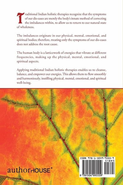 Traditional Indian holistic therapies recognize that the symptoms of our dis-eases are merely the body's innate method of correcting the imbalances within, to allow us to return to our natural state of wholeness. The imbalances originate in our physical, mental, emotional, and spiritual bodies; therefore, treating only the symptoms of our dis-eases does not address the root cause. The human body is a latticework of energies that vibrate at different frequencies, making up the physical, mental, emotional, and spiritual aspects. Applying traditional Indian holistic therapies enables us to cleanse, balance, and empower our energies. This allows them to flow smoothly and harmoniously, instilling physical, mental, emotional, and spiritual well-being.