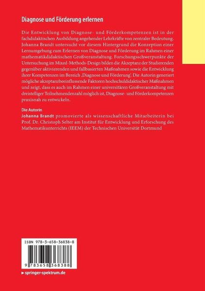 Die Entwicklung von Diagnose- und Förderkompetenzen ist in der fachdidaktischen Ausbildung angehender Lehrkräfte von zentraler Bedeutung. Johanna Brandt untersucht vor diesem Hintergrund die Konzeption einer Lernumgebung zum Erlernen von Diagnose und Förderung im Rahmen einer mathematikdidaktischen Großveranstaltung. Forschungsschwerpunkte der Untersuchung im Mixed-Methods-Design bilden die Akzeptanz der Studierenden gegenüber aktivierenden und fallbasierten Maßnahmen sowie die Entwicklung ihrer Kompetenzen im Bereich 'Diagnose und Förderung'. Die Autorin generiert mögliche akzeptanzbeeinflussende Faktoren hochschuldidaktischer Maßnahmen und zeigt, dass es auch im Rahmen einer universitären Großveranstaltung mit dreistelliger Teilnehmendenzahl möglich ist, Diagnose- und Förderkompetenzen praxisnah zu entwickeln.