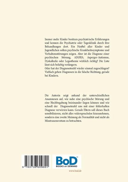 Immer mehr Kinder besitzen psychiatrische Erfahrungen und kennen die Psychiatrie oder Tagesklinik durch ihre Behandlungen dort. Ein Fünftel aller Kinder und Jugendlichen sollen psychische Krankheitssymptome und Verhaltensstörungen zeigen. Aber ist die Diagnose einer psychischen Störung, AD(H)S, Asperger-Autismus, Dyskalkulie oder Legasthenie wirklich richtig? Die Liste lässt sich beliebig verlängern. Oder hat der Diagnoseteufel wieder einmal zugeschlagen? Vielfach gehen Diagnosen in die falsche Richtung, gerade bei Kindern. Die Autorin zeigt anhand der unterschiedlichsten Anamnesen auf, wie nahe eine psychische Störung und eine Hochbegabung beieinander liegen können und wie schnell der Fehlerteufel uns mit einer fehlerhaften Diagnose verwirren kann. Gerade Eltern soll dieses Buch sensibilisieren nicht alles widerspruchslos hinzunehmen, sondern eine zweite Meinung als Normalität und nicht als Mißtrauensvotum zu betrachten.