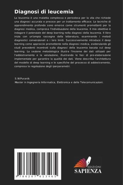 La leucemia è una malattia complessa e pericolosa per la vita che richiede una diagnosi accurata e precoce per un trattamento efficace. Le tecniche di apprendimento profondo sono emerse come strumenti promettenti per la diagnosi medica, compresa l'individuazione della leucemia. Il mio obiettivo è indagare il potenziale del deep learning nella diagnosi della leucemia. Il libro inizia con un'ampia rassegna della letteratura, esaminando i metodi diagnostici convenzionali e i loro limiti. Successivamente introduce il deep learning come approccio promettente nella diagnosi medica, evidenziando gli studi precedenti incentrati sulla diagnosi della leucemia basata sul deep learning. La sezione metodologica illustra l'insieme dei dati utilizzati per l'addestramento e la valutazione, illustrando le fasi di pre-elaborazione implementate per garantire la qualità dei dati. Viene descritta l'architettura del modello di deep learning e le specifiche del processo di addestramento, compresa la regolazione degli iperparametri.