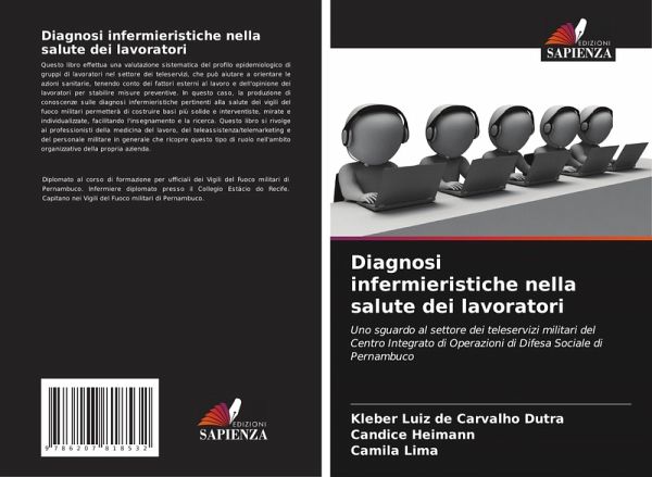 Questo libro effettua una valutazione sistematica del profilo epidemiologico di gruppi di lavoratori nel settore dei teleservizi, che può aiutare a orientare le azioni sanitarie, tenendo conto dei fattori esterni al lavoro e dell'opinione dei lavoratori per stabilire misure preventive. In questo caso, la produzione di conoscenze sulle diagnosi infermieristiche pertinenti alla salute dei vigili del fuoco militari permetterà di costruire basi più solide e interventiste, mirate e individualizzate, facilitando l'insegnamento e la ricerca. Questo libro si rivolge ai professionisti della medicina del lavoro, del teleassistenza/telemarketing e del personale militare in generale che ricopre questo tipo di ruolo nell'ambito organizzativo della propria azienda.