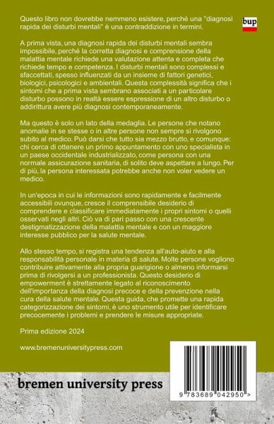 Questo libro non dovrebbe nemmeno esistere, perché una "diagnosi rapida dei disturbi mentali" è una contraddizione in termini. A prima vista, una diagnosi rapida dei disturbi mentali sembra impossibile, perché la corretta diagnosi e comprensione della malattia mentale richiede una valutazione attenta e completa che richiede tempo e competenza. I disturbi mentali sono complessi e sfaccettati, spesso influenzati da un insieme di fattori genetici, biologici, psicologici e ambientali. Questa complessità significa che i sintomi che a prima vista sembrano associati a un particolare disturbo possono in realtà essere espressione di un altro disturbo o addirittura avere più diagnosi contemporaneamente. Ma questo è solo un lato della medaglia. Le persone che notano anomalie in se stesse o in altre persone non sempre si rivolgono subito al medico. Può darsi che tutto sia mezzo brutto, e comunque: chi cerca di ottenere un primo appuntamento con uno specialista in un paese occidentale industrializzato, come persona con una normale assicurazione sanitaria, di solito deve aspettare a lungo. Per di più, la persona interessata potrebbe anche non voler vedere un medico. In un'epoca in cui le informazioni sono rapidamente e facilmente accessibili ovunque, cresce il comprensibile desiderio di comprendere e classificare immediatamente i propri sintomi o quelli osservati negli altri. Ciò va di pari passo con una crescente destigmatizzazione della malattia mentale e con un maggiore interesse pubblico per la salute mentale. Allo stesso tempo, si registra una tendenza all'auto-aiuto e alla responsabilità personale in materia di salute. Molte persone vogliono contribuire attivamente alla propria guarigione o almeno informarsi prima di rivolgersi a un professionista. Questo desiderio di empowerment è strettamente legato al riconoscimento dell'importanza della diagnosi precoce e della prevenzione nella cura della salute mentale. Questa guida, che promette una rapida categorizzazione dei sintomi, è uno strumento utile per identificare precocemente i problemi e prendere le misure appropriate.